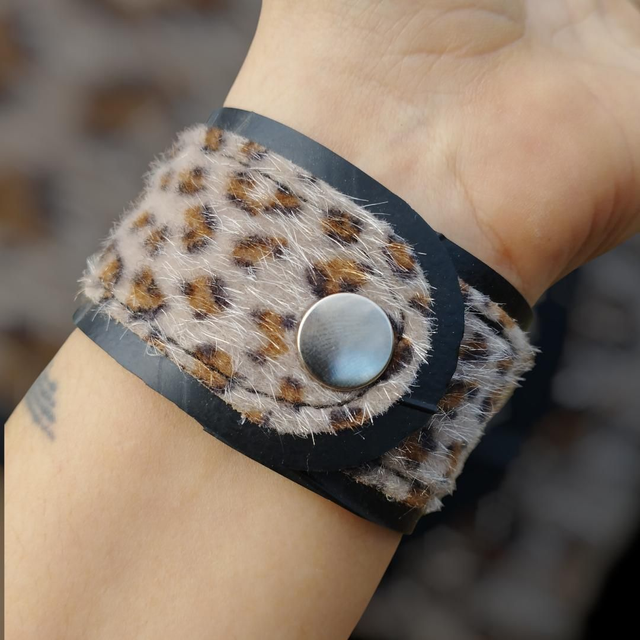 Bracelet en chambre à air de tracteur upcyclée et simili moumoute léopard. Réglable avec fermeture pression de 18 à 19 cm.