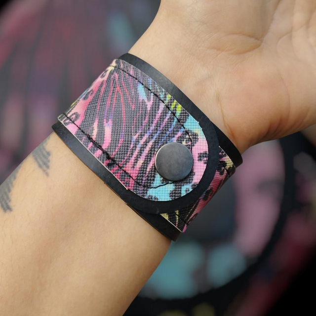 Bracelet en chambre à air de tracteur upcyclée et simili cuir arc en ciel zèbre et léopard. Réglable avec fermeture pression de 18 à 19 cm.