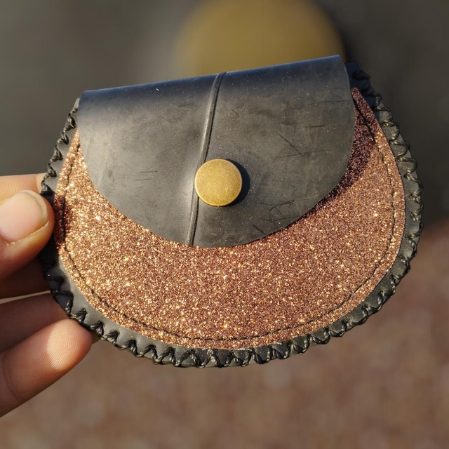 Porte monnaie en chambre à air de tracteur upcyclée et simili cuir marron pailleté. Fermeture pression.