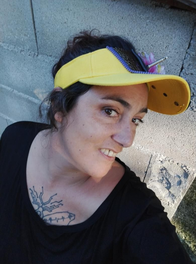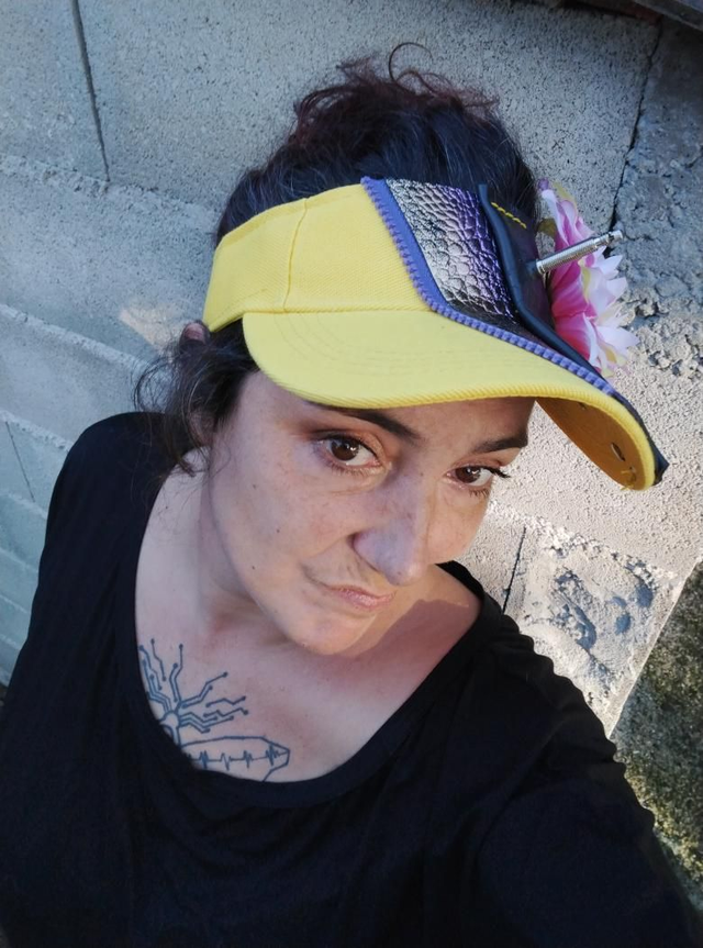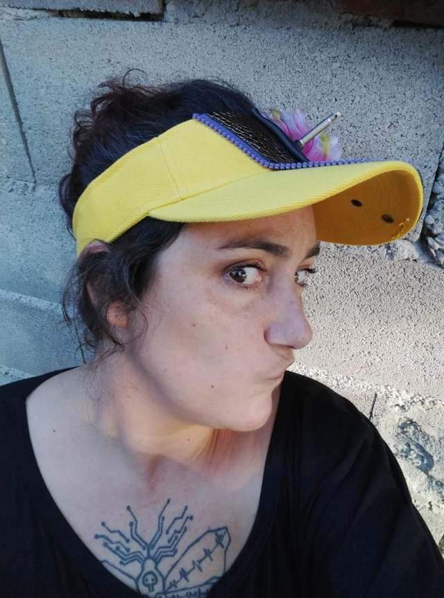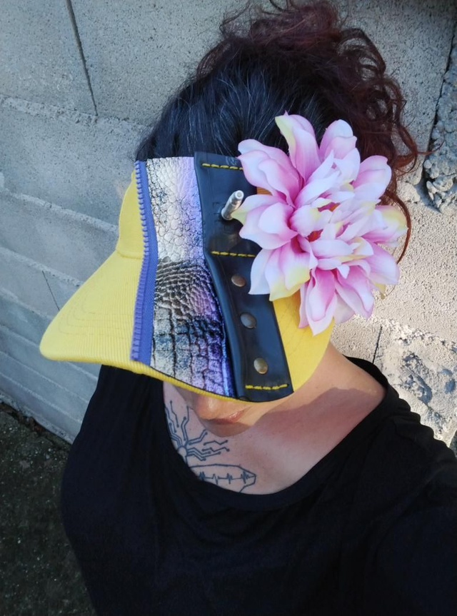 Visière jaune custom avec du simili croco licorne, ornée d’une fleur rose, d’un zip et de chambre à air de vélo upcyclée.