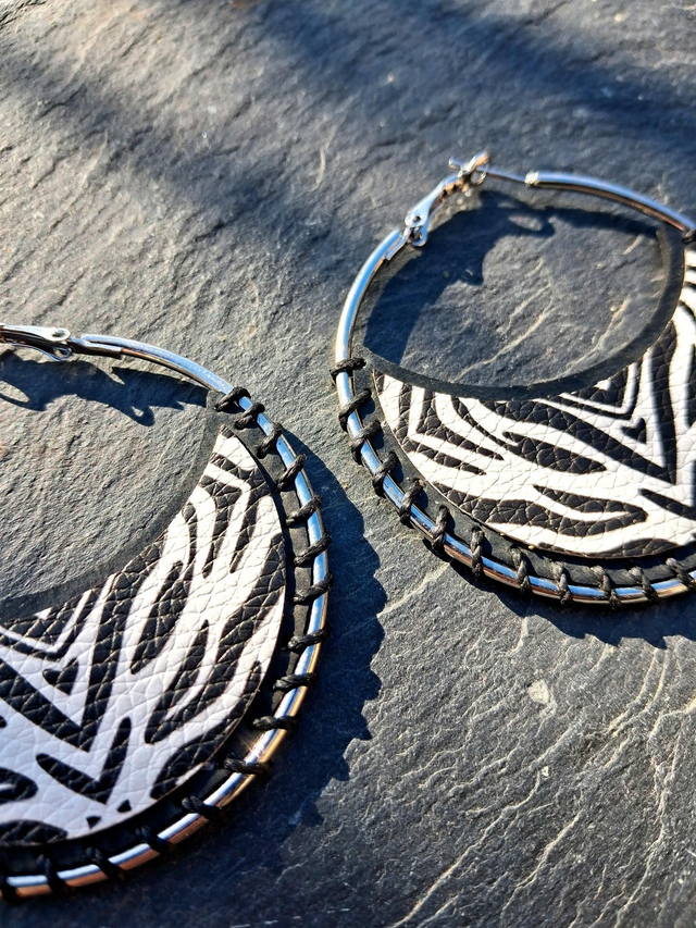 Créoles argentées inox customisées avec de la chambre à air de tracteur upcyclée et du simili cuir symétrie noir et blanc.