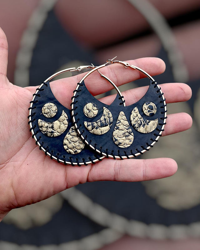 Créoles inox doré customisées avec de la chambre à air de tracteur upcyclée et formes en simili doré.
