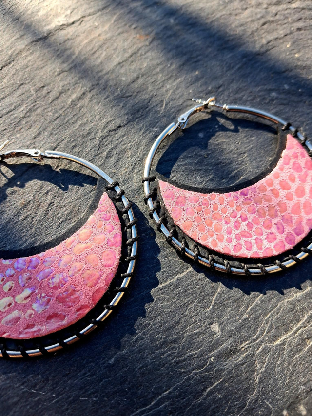 Créoles argentées inox customisées avec de la chambre à air de tracteur upcyclée et du CUIR rose nacré. ( NO VEGAN )