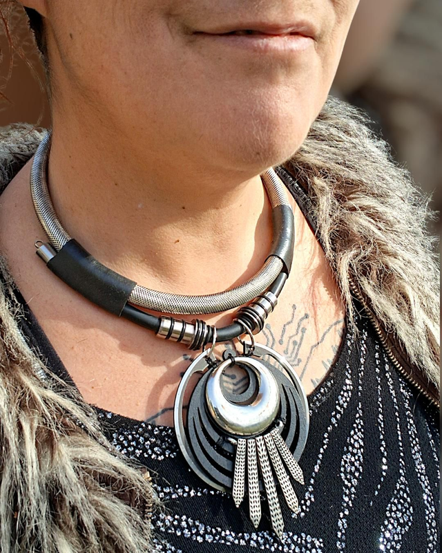 Cette création faite main se distingue par un pendentif en bois graphique composé de cercles et d'éléments métalliques upcyclés.