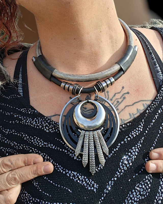 Collier torque artisanal au design contemporain mêlant laiton, métal, bois, câbles électriques et chambre à air de vélo.