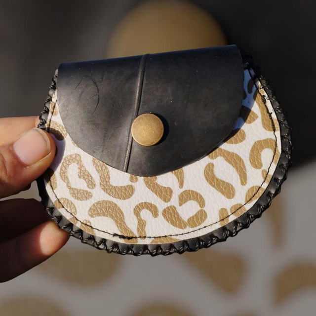 Porte monnaie en chambre à air de tracteur upcyclée et simili cuir blanc et doré léopard. Fermeture pression.